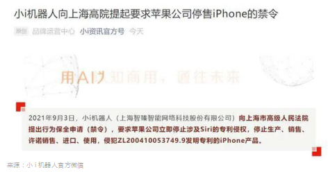 On September 7, Xiaoi robot official WeChat release the message that on September 3, Xiaoi robot (Shanghai Xiaoi Robot Technology Co., Ltd.) has make an application for behavior preservation (ban) to the Shanghai High People's Court, asked apple to immediately stop involving siri patent infringement, stop production, sales, sales promise, import, use the infringement of ZL200410053749.9 invention patent of iphone products.